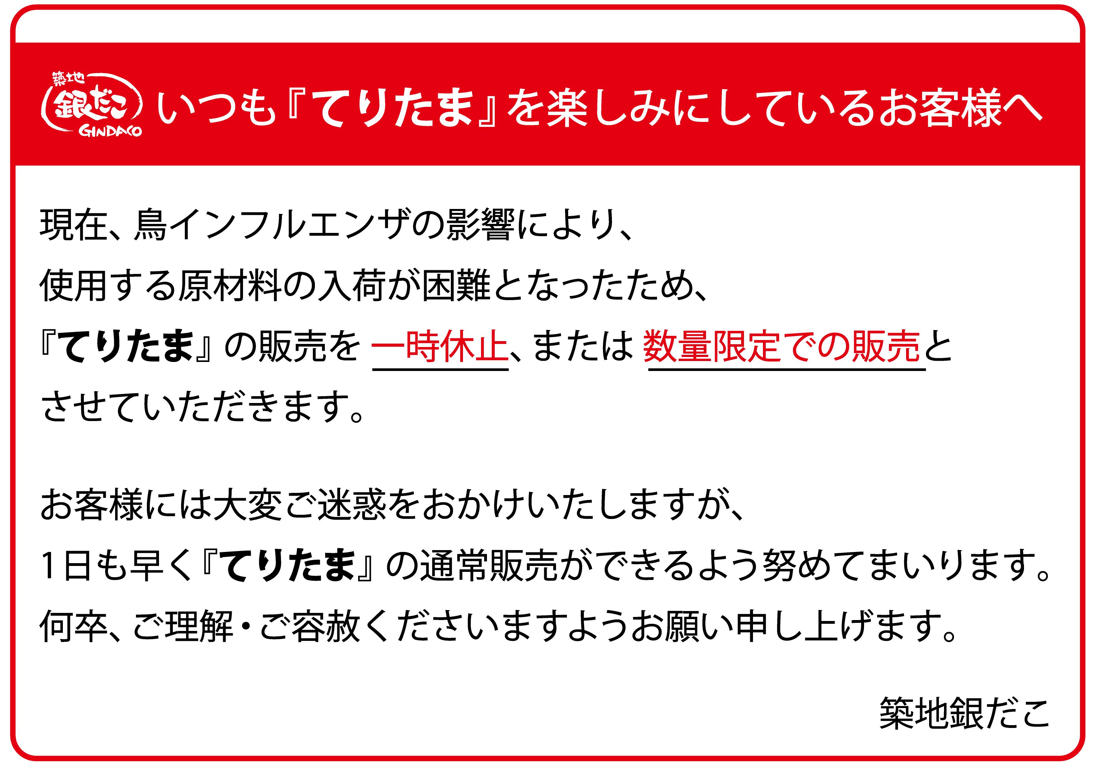 メニュー今すぐ注文お店に行くニュースもっとたのしく!こだわり・ヒミツメニュー今すぐ注文お店に行くニュースもっとたのしく!こだわり・ヒミツおトクな情報を配信中!銀だこソーシャルメディア公式アカウントお得なスタンプカードメニュー今すぐ注文お店に行くニュースNewsニュース詳細お知らせ2023.02.20 月いつも『てりたま』を楽しみにしてくださっているお客様へ、商品販売の一時休止、または数量限定販売のお知らせお知らせ一覧へもどるSHAREお得なスタンプカードデリバリー大口注文 ご相談窓口お得なスタンプカードデリバリー大口注文 ご相談窓口