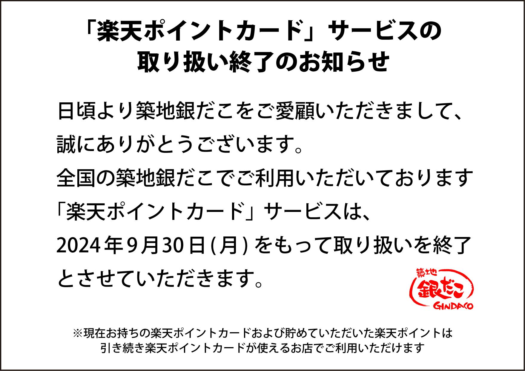 メニュー今すぐ注文お店に行くニュースもっとたのしく!こだわり・ヒミツメニュー今すぐ注文お店に行くニュースもっとたのしく!こだわり・ヒミツおトクな情報を配信中!銀だこソーシャルメディア公式アカウントお得なスタンプカードメニュー今すぐ注文お店に行くニュースNewsニュース詳細重要なお知らせ2024.07.01 月「楽天ポイントカード」サービスの取り扱い終了のお知らせお知らせ一覧へもどるSHAREお得なスタンプカードデリバリー大口注文 ご相談窓口お得なスタンプカードデリバリー大口注文 ご相談窓口