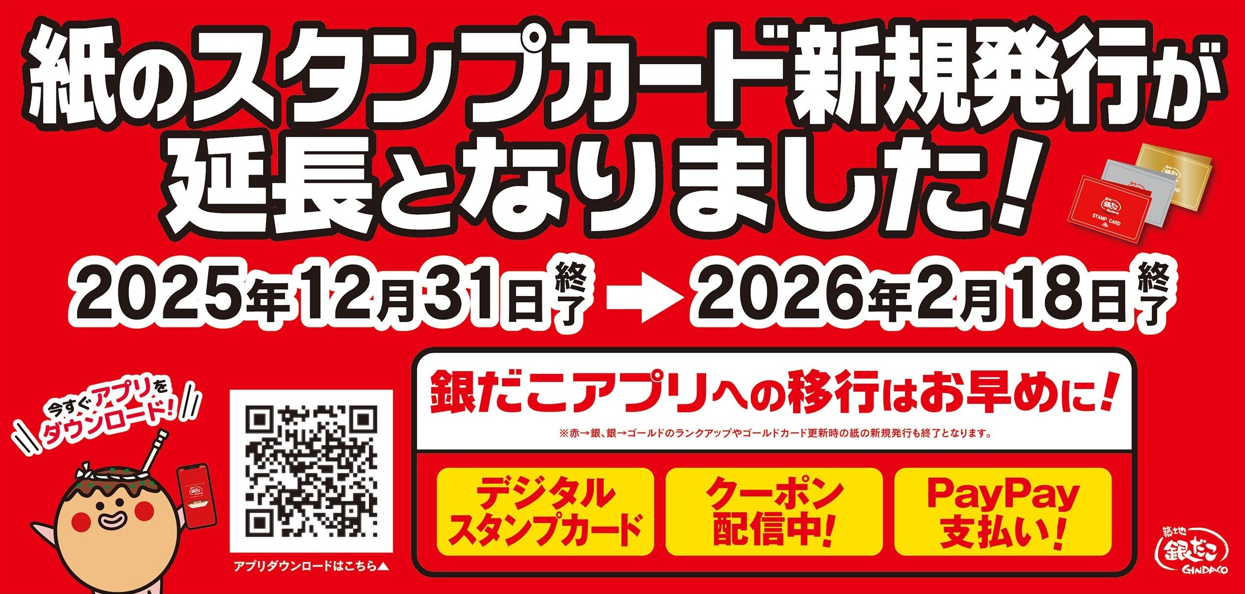『紙の銀だこスタンプカード』新規発行終了日 | 2026年2月18日(予定)※赤→銀、銀→ゴールドのランクアップやゴールドカード更新時の紙の新規発行も終了となります |