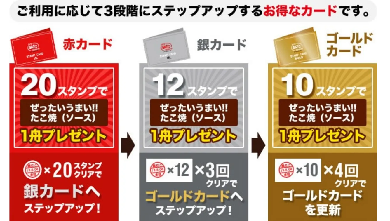 ※カードをお持ちでない場合、その場ですぐに発行できますのでお気軽にスタッフへお申し付けください。 - 交換対象のたこ焼は、「ぜったいうまい!! たこ焼(ソース、8個入りまたは6個入り)」、及び「定番のトッピング付たこ焼 ※1」6個入りのいずれかからお選びいただけます。