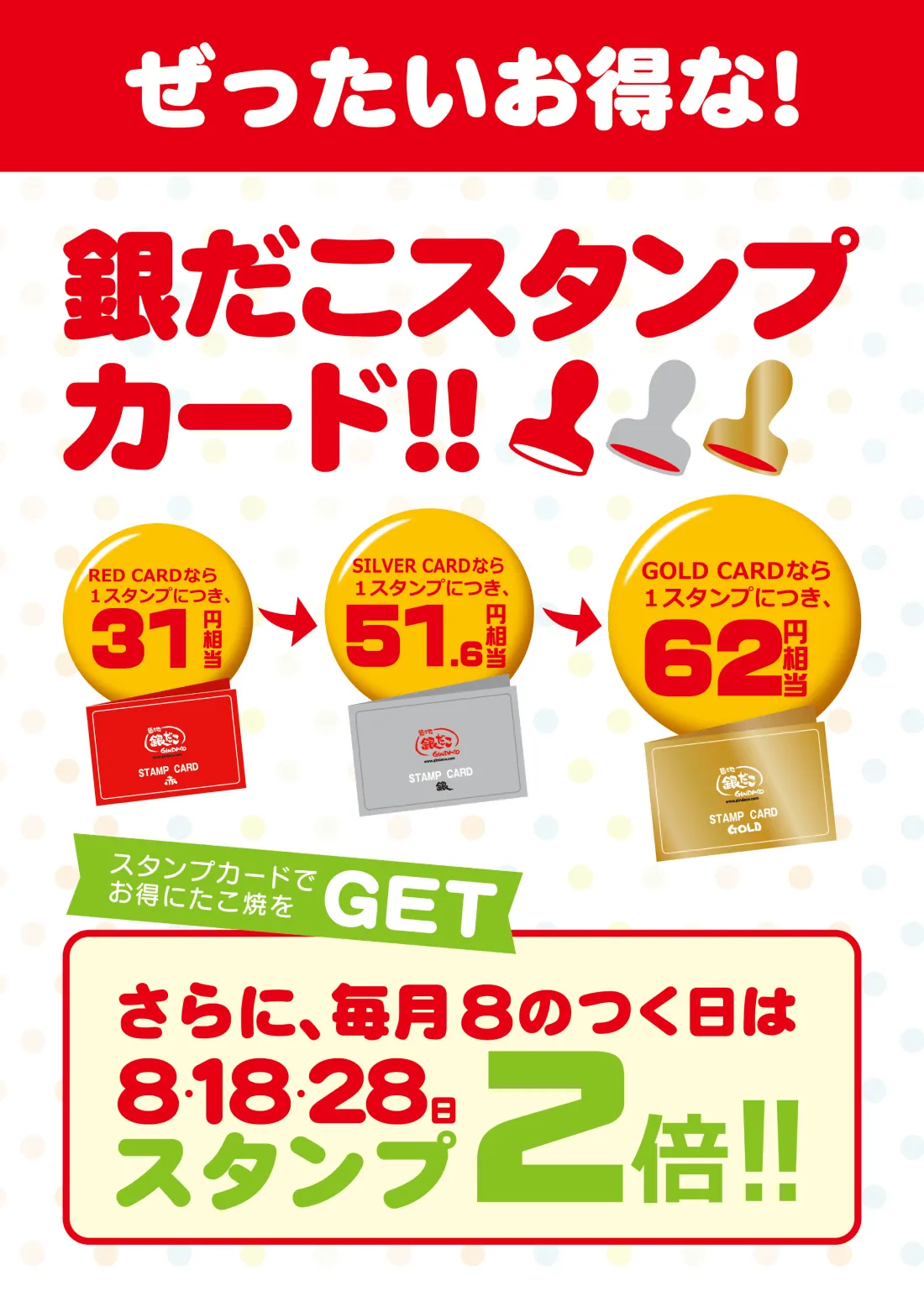 毎月8日、18日、28日はたこ焼1舟(6個入り以上)で2個のスタンプがもらえるスペシャルデーも実施!!